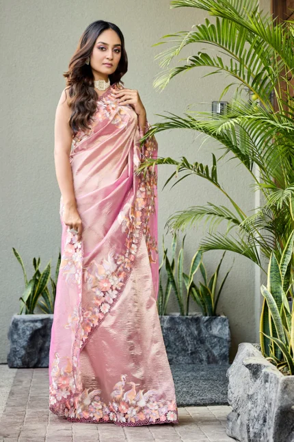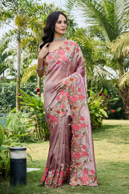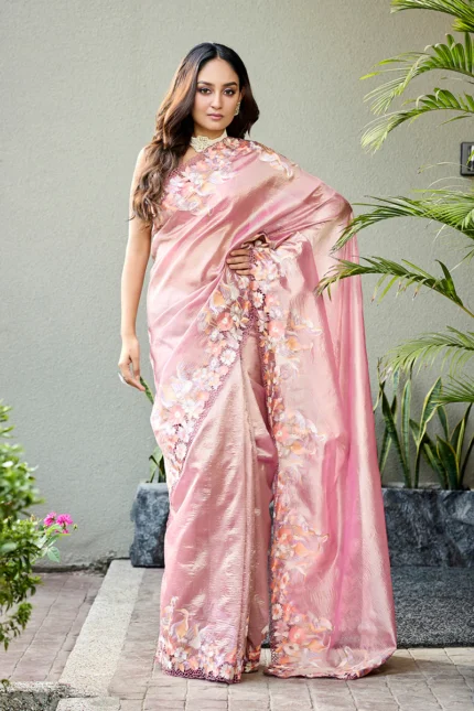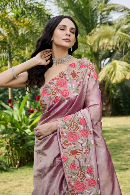 Elegant Blue Draped Saree with Floral Hand Embroidery