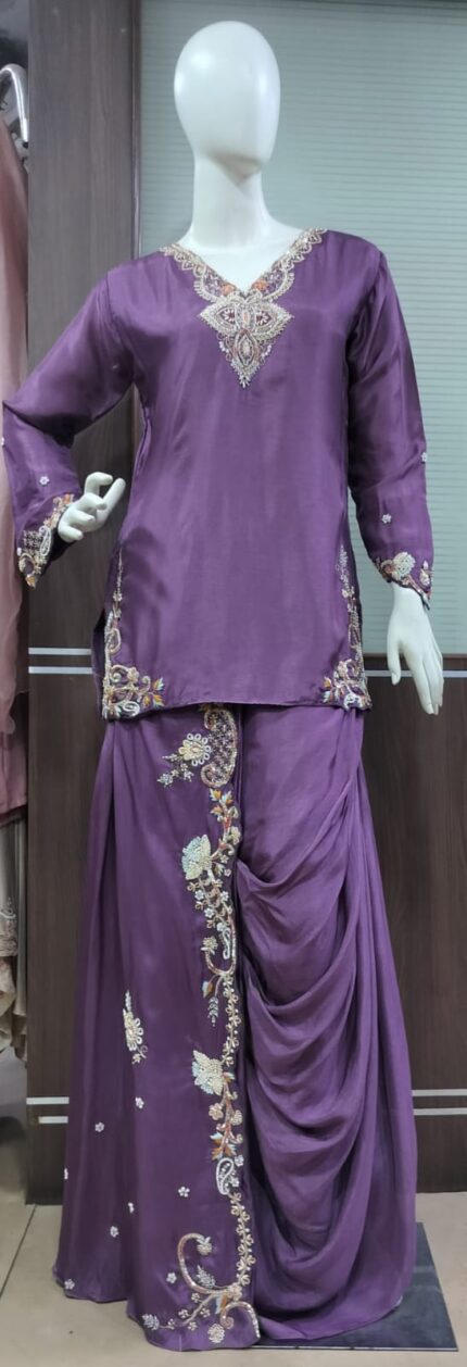 Koti style jacket on crop top paired with skirt with hand embroidered